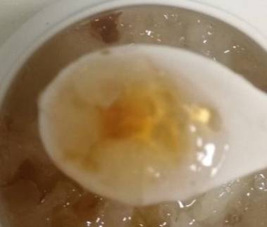 桃胶永热水冲了一下就能闻到一些香味,煮的桃胶银耳汤,加了枸杞等,煮出来色泽很鲜艳。桃胶入口很Q弹,像果冻,一不小心就多吃了。因为泡的太多了,所以自己家只煮了一半,剩下的第二天送给邻居家熬银耳汤吃了。在碗里加水泡了一晚上,又发了不少。邻居反馈说蛮好吃的哦。
