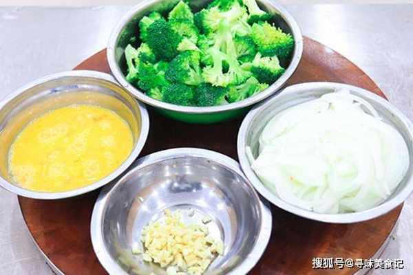 锅里再烧油,放入洋葱、蒜末爆炒一分钟,然后倒入西蓝花,加食盐2克、生抽10克,继续翻炒至入味;倒入鸡蛋翻炒均匀即可出锅。