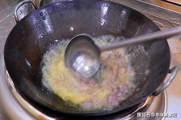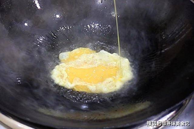 锅里烧油,高油温倒入蛋液,快速炒散、炒定型后倒出备用。