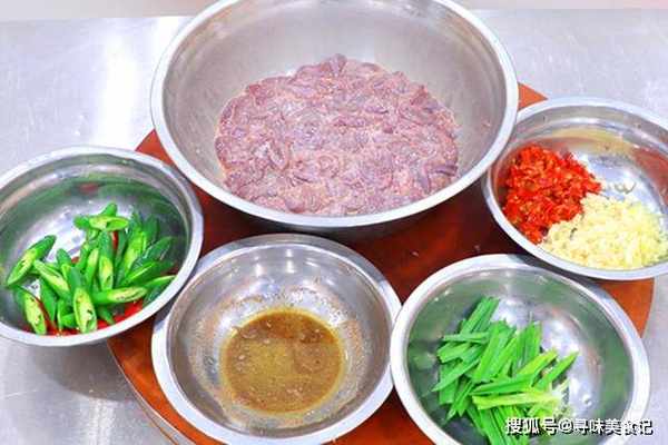 首先,我们把猪肝放在清水中浸泡一个小时,去除里面的血水和毒素。然后撕去上面的筋膜,把猪肝切成3毫米左右的薄片,用啤酒充分洗去血水后加入一勺食盐、一小撮淀粉锁住水分腌一下;生姜切成末,大蒜拍扁也切成末,加入剁椒酱20克;再准备适量的小米椒和线椒,洗干净以后切成段为菜品增色;另外切一点蒜苗备用;准备一个小碗,加入食盐2克,胡椒粉2克,鸡粉2克,再倒入陈醋5克,花椒油5克,搅拌均匀备用,碗料提前调好方便一会快速爆炒出锅。