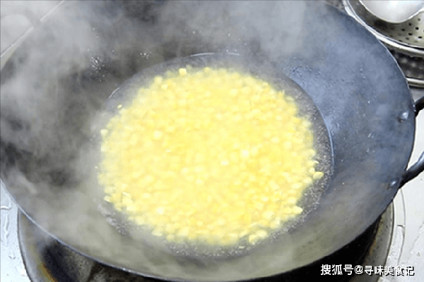 锅里烧水,加入食盐和植物油,把玉米粒放进去,中火煮5分钟,煮熟后倒出来、控水备用。