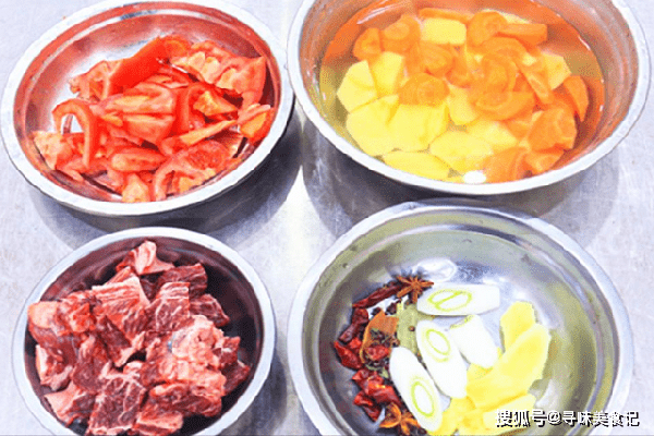 二斤牛腩,切成两厘米左右的牛肉块;土豆一个、切成均匀的滚刀块,胡萝卜也切成同样大小的滚刀块,一起用清水泡上、防止氧化变色;番茄洗干净、切成小块;再切点葱段、姜片放在一起,加入八角、香叶、桂皮、花椒、干辣椒段备用。