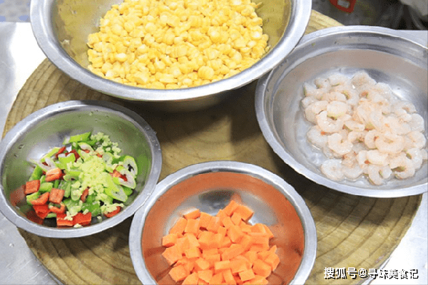 玉米去须后洗干净,把玉米籽切下来;适量的鲜虾仁、清洗干净;胡萝卜切成小丁,青红椒都切成粒,再切点葱花、姜末备用。