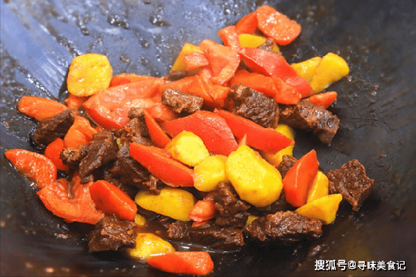 5分钟以后汤汁也基本上收干了,这个时候放入番茄、翻炒出红汁,勾入一点水淀粉、让料汁更好地吸附在食材表面、美味即成。