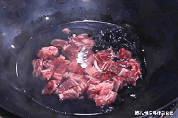 锅内烧水、冷水放入牛腩,慢慢煮出里面的血水和杂质,水烧开以后打去锅中的浮沫,大约焯水2分钟把牛腩倒出来,用清水冲洗干净、沥水备用。