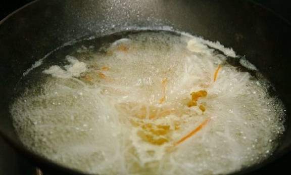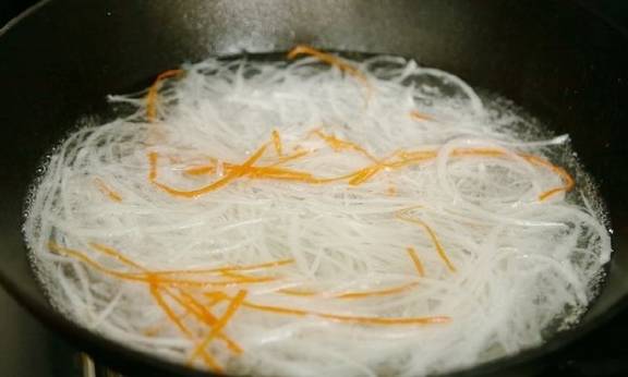 3、锅里水烧开,加入白萝卜丝煮五分钟左右,为了好看,特意加了几根胡萝卜丝配色。