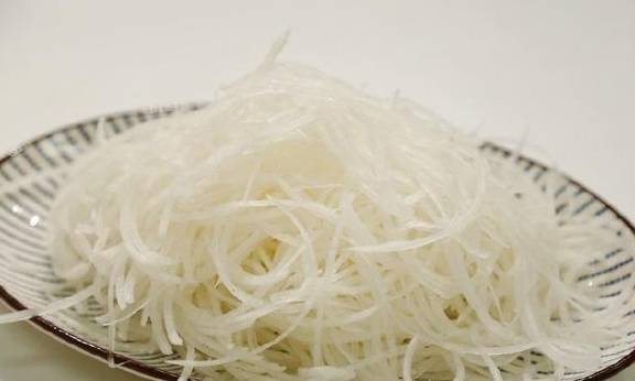2、用刨丝器刨成丝,尽量买比较直比较细的那种白萝卜,刨成长长的丝。