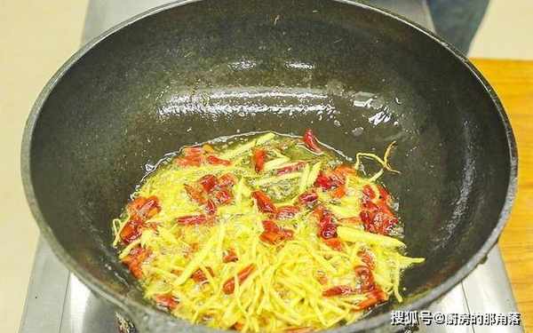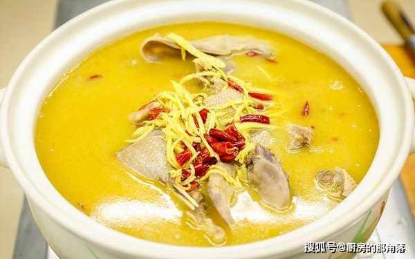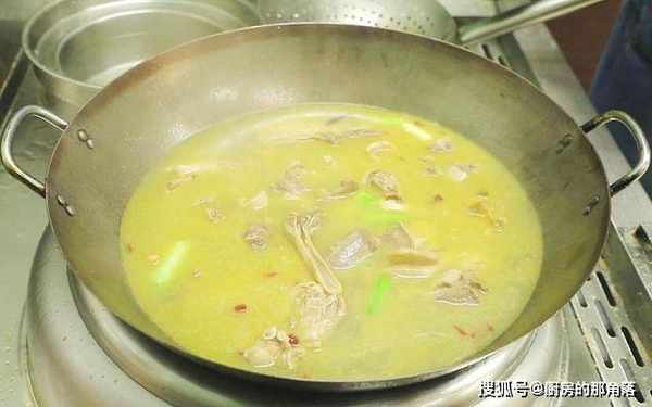 起锅烧油,加入姜丝和泡好的辣椒炒香,然后加入鹅汤煮开烹出香味,然后关火。