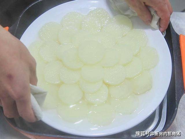 把切好的山药摆在篦子上,然后放入锅中蒸8分钟左右,取出山药倒掉盘中的水分。
