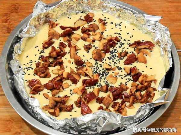 取一个深一点的盘子在里面垫上锡箔纸,再刷上植物油方便蒸熟以后脱模,把玉米面糊倒在里面撒上黑芝麻,再切一些红枣粒也撒在上面,用盘子盖住发酵20分钟。