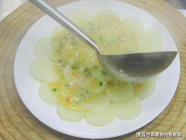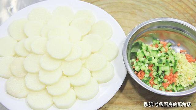 准备2段山药去皮后清洗干净,然后切成均匀薄片,放入加了白醋的清水中浸泡防止山药氧化变黑,处理山药戴上手套,防止皮肤过敏;准备几粒大蒜压扁切成末;然后再切一点胡萝卜丁和黄瓜丁。