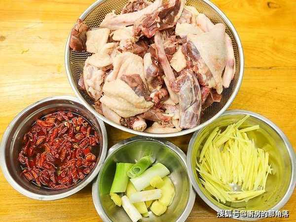 一只处理好的大鹅去掉肺管和屁股,然后切成小块,然后倒进清水中浸泡出血水,然后控干水分备用;碗中抓入干辣椒,再倒入清水浸泡去除辛辣和燥性;一块生姜一分为二,一半切成姜片、一半切成姜丝分开放;大葱切成段和姜片放在一起;碗中加入玉竹、党参、陈皮、白芷、草果备用;一把小葱切成段。