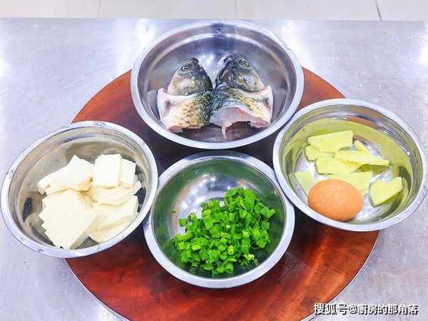 鲫鱼头对半劈开,去除牙齿和鱼鳃;一块嫩豆腐切成豆腐片;生姜切成片;小葱切成葱花;一个鸡蛋备用。