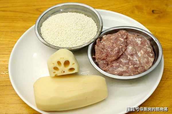 糯米提前一晚泡发;莲藕去皮、切成碎丁;适量的五花肉馅放入盆中,加入食盐、味精、胡椒粉、鸡粉、生抽、蚝油、料酒抓拌均匀,倒入一个鸡蛋,淋入适量的葱姜水,继续搅拌至上劲增加滑嫩感,抓入一小把淀粉增加抱合力,放入藕丁,继续搅拌摔打5分钟,至肉馅成团备用。