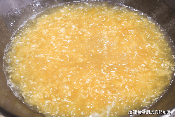 4.时间差不多了来看一下,银耳羹已经起黏 ,色泽晶莹、汤羹浓郁,这个时候我们把米酒倒进去,让酒糟的香气和银耳羹充分融合。