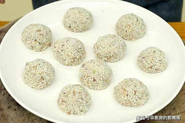 然后把肉馅团成一个一个的丸子,裹上一层糯米,放在盘中准备蒸制。