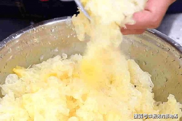 首先把银耳用凉水浸泡1个小时,泡发以后去除黄色的硬根,再剪成小块,银耳一定要用凉水泡发,口感才会清脆,用热水泡出来比较绵软,而且不容易出胶。