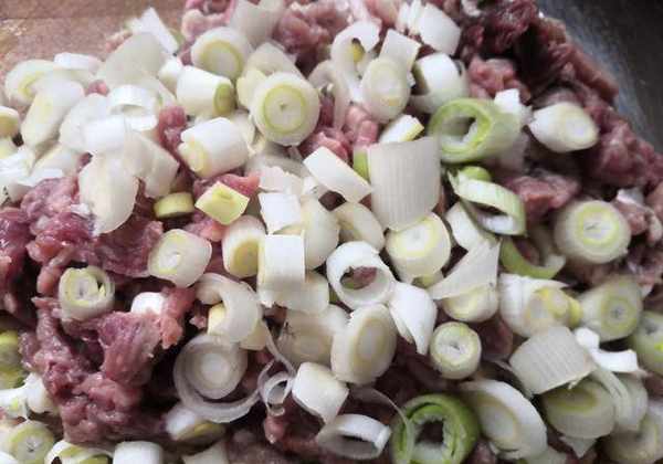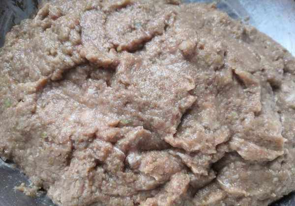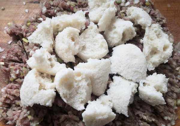 剁成肉馅以后,再加入适量的馒头,(一斤牛肉,按三两馒头加就可以)馒头要去皮,然后继续剁,剁的越细越好。