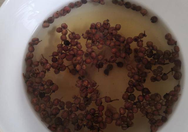 把适量的花椒和姜放到一个碗里,倒入适量的温水,至少要浸泡一个小时。