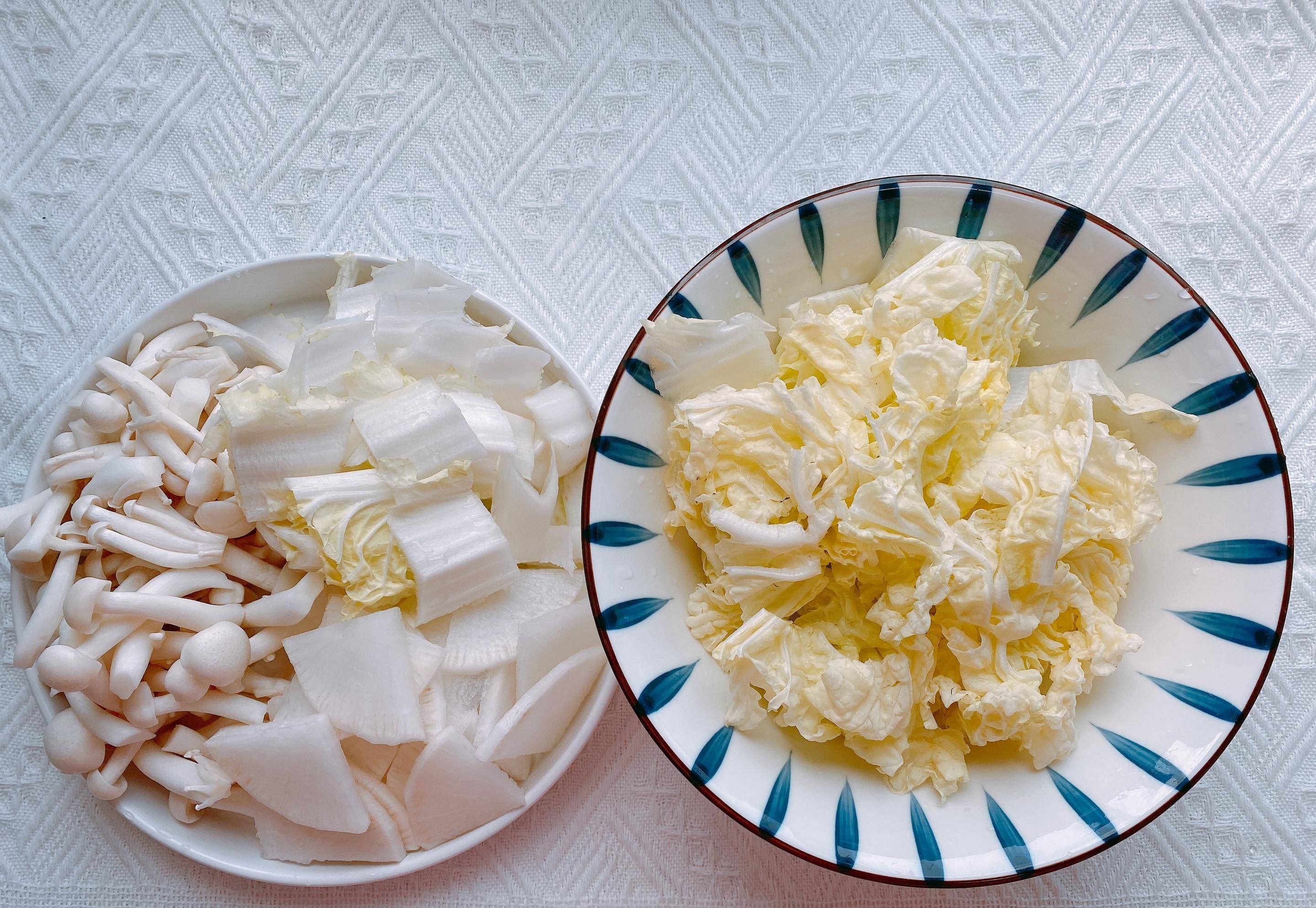 2、白玉菇切掉根部,清洗干净备用,白萝卜去皮切成薄片,萝卜在这里不能切得很大块,因为这些食材都很容易煮熟,萝卜切得太大块,等萝卜炖煮,其它食材会过于软烂,为了成熟度一致,萝卜要切成薄片,白菜清洗干净之后,白菜叶子和白菜梗分开;