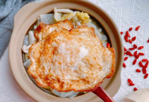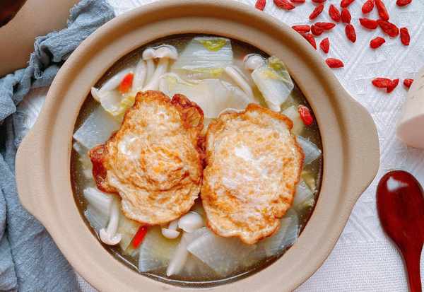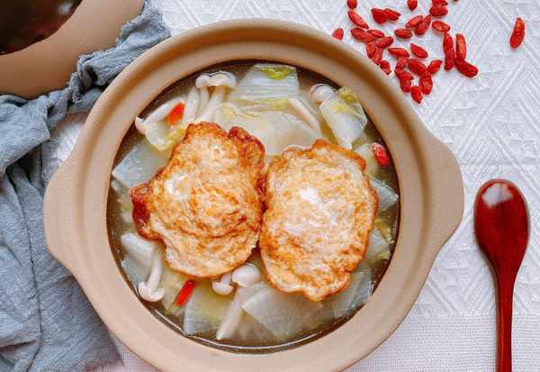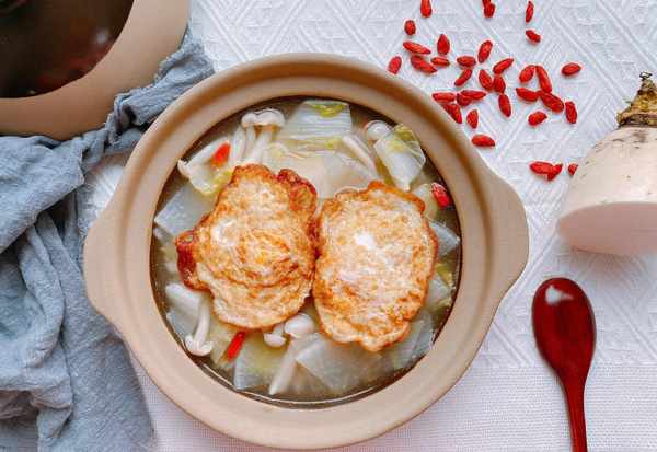 【原材料】萝卜(三分之一个)、白菜、白玉菇、鸡蛋、食用油、食盐、胡椒粉、枸杞;