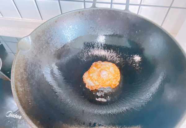 3、锅烧热,加入适量的食用油,下入鸡蛋,底面煎至凝固之后,翻面,煎成荷包蛋,两个荷包蛋煎好之后,先出锅备用;