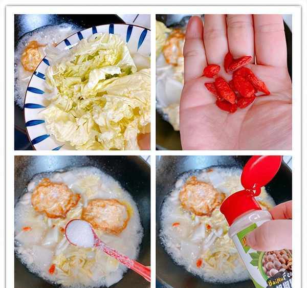 5、煮到萝卜变色变软之后,下入白菜叶子和枸杞,开始调味,一勺食盐、少许白胡椒粉,一点鸡精,翻拌均匀,出锅;