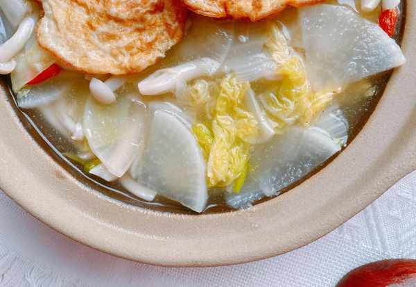 6、白菜萝卜汤可以盛在砂锅中,冬季放在专用的酒精炉上加热,小火慢炖,热乎乎暖洋洋的;