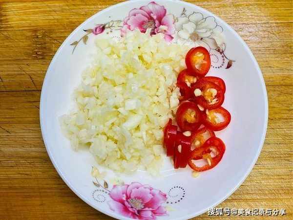 3、另外准备5瓣大蒜末,喜欢吃辣的小伙伴,再来2个小米椒,全部切好之后,放入盘中备用,工作齐全以后,可以下锅炒了。