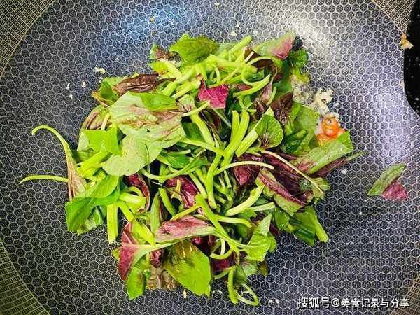 6、大概30秒以后,再放入苋菜叶片,叶片遇热就软,软了也就熟了,炒过会影响风味,等菜叶变软,可以少淋点清水,放盐调味,等调味品融化以后,即可出锅装盘。