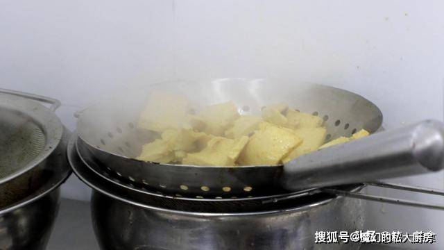 ,把豆腐炸至表皮变硬呈金黄色,倒出控干油。