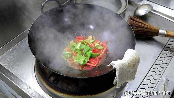 ,肉片上色以后,加入少量清水,翻炒均匀,倒入青红椒片接着开始调味,