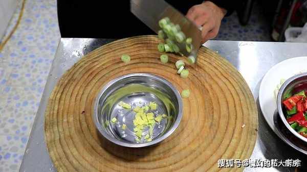 再准备一个小盆,生姜一小块拍扁以后,切成姜粒,大葱白一根切成葱段,抓入干辣椒一小把放在一起。
