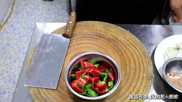青椒一个,从中间切开,去籽以后切成三角块,红椒一个,同样切成三角块。