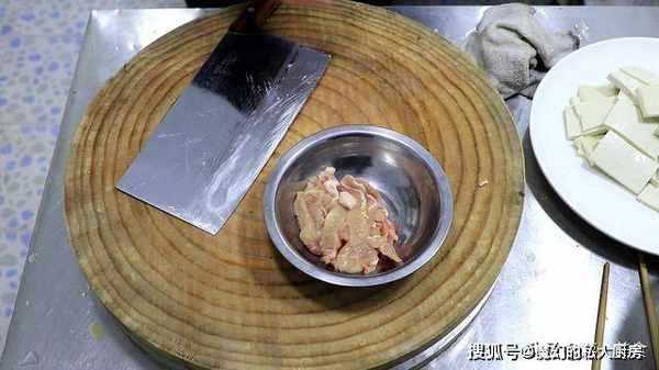 猪肉一小块,切成薄片放在小盆中。
