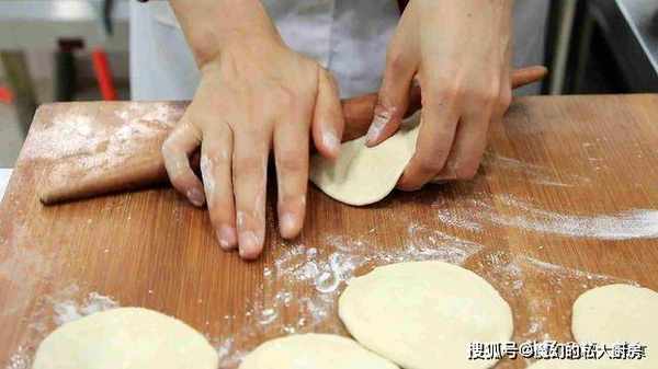 4.从中间挖个孔,搓成粗条,切成大小均,等份的面剂子,把每个面剂子,揉搓光滑,整成一个圆,拿擀面杖,擀成中间厚四周薄的一个片。