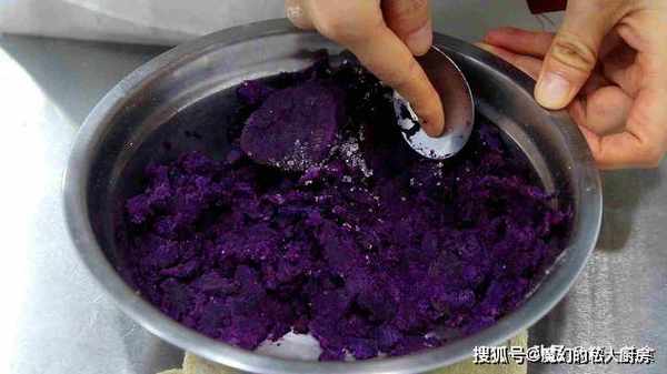 1.蒸好的紫薯一块,加入白糖5克,增加紫薯的甜味,用勺子按压成紫薯泥。