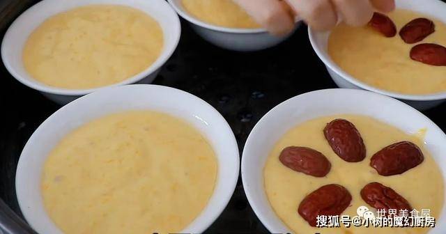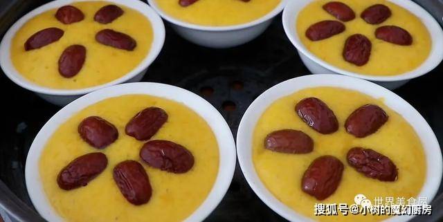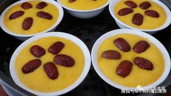 第四步,准备一些小饭碗,在饭碗的底部刷一层油,然后倒入南瓜糊。还可以在表面点缀一些红枣,也可以放其他的葡萄干这些。继续醒发12分钟,然后热水上锅蒸20分钟。