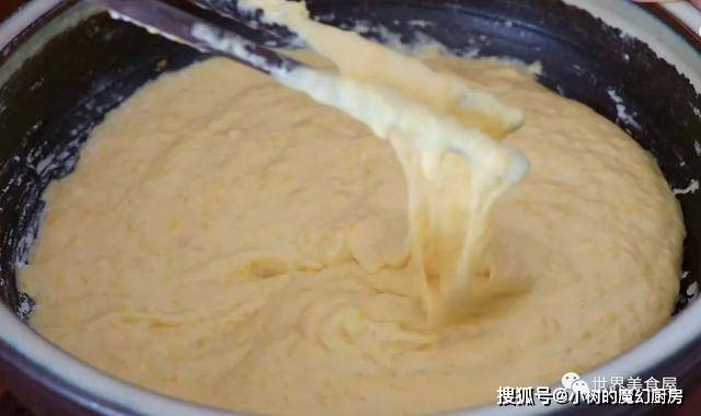 第三步。继续在南瓜泥中倒入200克普通面粉,混合均匀变成南瓜糊。