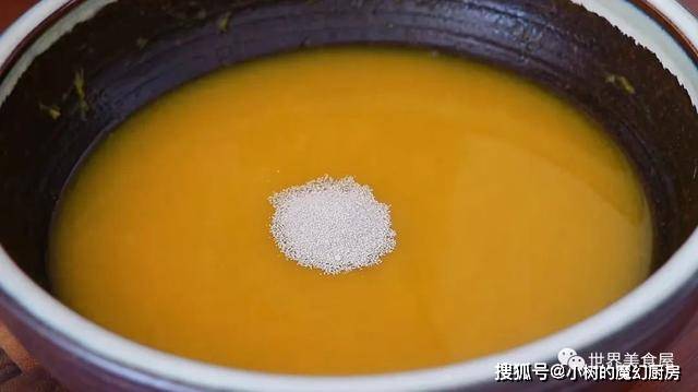 第二步,蒸熟的南瓜。碾碎成南瓜泥。加入一碗清水,少许砂糖。搅拌均匀,等它冷却之后,再放入两克酵母。