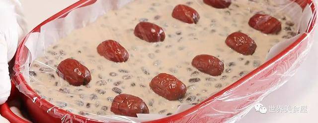 第三步,搅拌好的红豆糯米糊,将它平放在整碗中,表面可以点缀一些红枣,。平整表面,随后覆盖一张保鲜膜。继续上锅蒸20分钟。