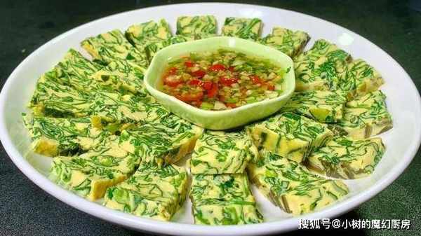 6、煮熟的菠菜蒸蛋取下来,放凉后切成小块,摆放在碟子上,沾着蘸酱就可以吃。口感滑嫩,有菠菜的清香,味道鲜美。