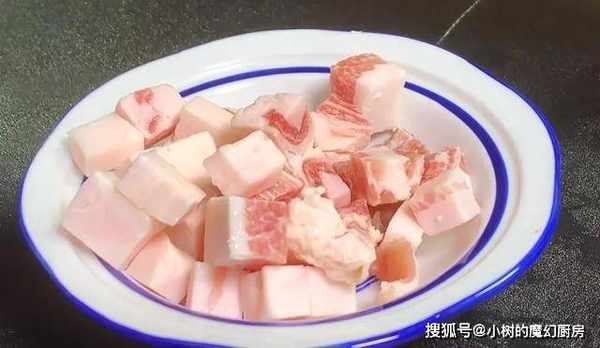 3、猪肉选择肥肉多余瘦肉的,清洗干净,也切丁备用。