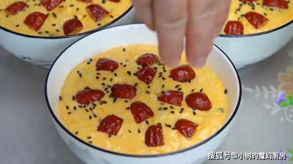 4、将面团分装在饭碗中,表面平整,点缀一些红枣,撒一些芝麻。