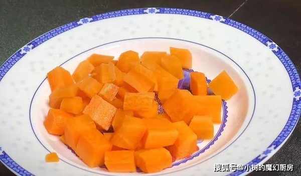 2、接着将胡萝卜去皮,洗干净,同样切丁。