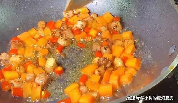 4、热锅,将切丁的猪肉倒里面,小火翻炒,炒出油水。