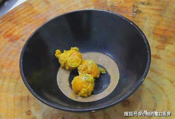 首先我们准备一下食材,咸鸭蛋3个,剥去外皮,把蛋黄和蛋清分离,在这里我们只用蛋黄,然后把剥出来的鸭蛋黄切碎,放在碗里。
