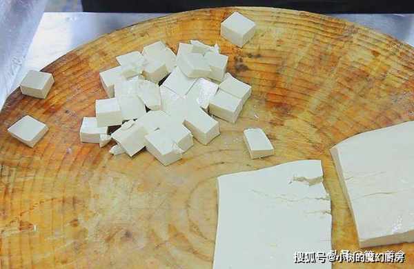 嫩豆腐一块,切成一厘米左右的方块,放在盆里备用。
