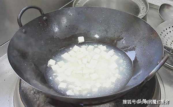 食材准备好以后,我们把豆腐焯一下水,豆腐在焯水的时候,在水里加入一勺食盐,这样可以使豆腐在烹饪过程中不容易碎。