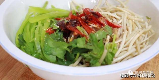 8、接下来给它调味,加入香菜、食盐、鸡精、生抽、红油、香醋等配料。
